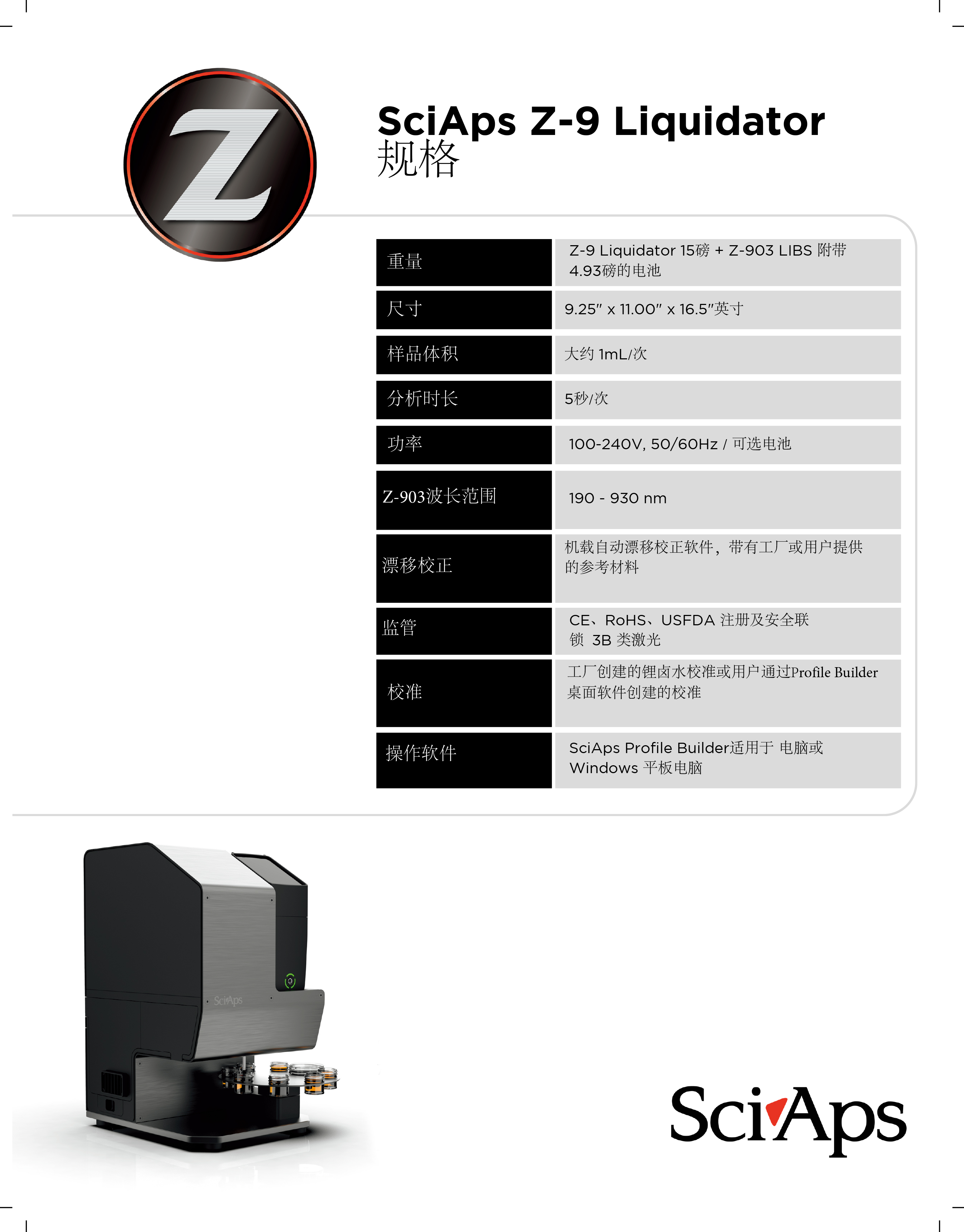 Z-9 Liquidator由SciAps Z-903手持式 LIBS分析仪提供动力,配备工厂制造的锂卤水校准。用户还可以通过Profile Builder软件开发自定义校准,以进一步优化性能。